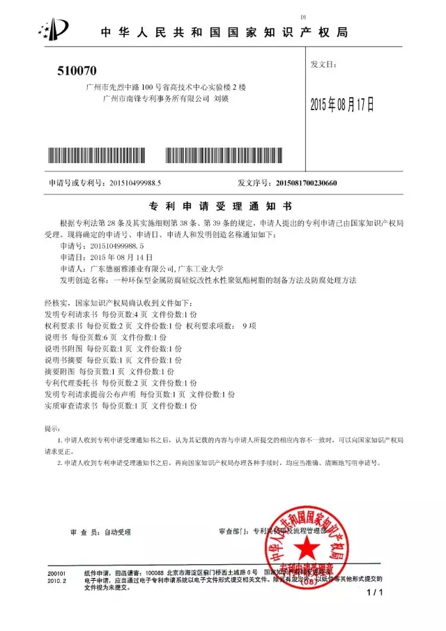 近日,由廣東德麗雅漆業有限公司與廣東工業大學聯合發的“硅烷改性水性聚氨酯樹脂”項目順利完成,廣東德麗雅漆業有限公司對其擁有完全知識產權,并且向國家知識產權局提出了專利申請,專利名稱為“一種環保型金屬防腐硅烷改性水性聚氨酯樹脂的制備方法及防腐處理方法”。