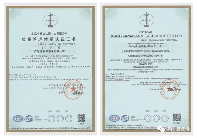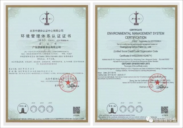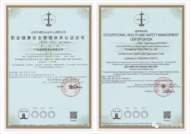 2017年5月,廣東德麗雅漆業有限公司正式通過ISO9001(質量管理體系)、ISO14001(環境管理體系)、OHSAS18001(職業健康安全管理體系)三大體系的認證隨著認證的正式通過,我公司的產品質量將有一個更穩定的保障,也會促進公司管理的提高與規范。