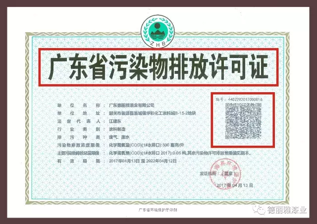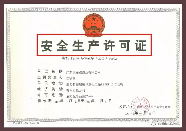 廣東德麗雅漆業有限公司積極配合國家整治動,作為遵紀守法的企業標兵,德麗雅一直秉承“誠信為本、用心服務、主人翁精神”的企業核心價值觀,具備危險化學品安全生產許可證及污染物排放許可證的生產標準。