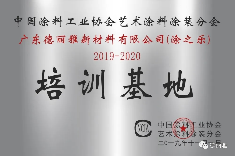 經過中國涂料工業協會藝術涂料涂裝分會的全面考察,2019年十一月,廣東德麗雅新材料有限公司(涂之樂)已獲評為中國藝術涂料培訓基地,通過在我司參加藝術涂料培訓,可獲得國家級墻藝師證書