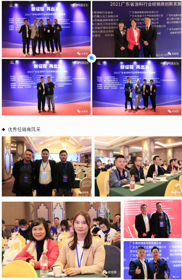 2021年11月22日,廣東省涂料行業協會在東莞市召開了“2021年廣東省涂料行業經銷商創新發展峰會”。廣東德麗雅新材料有限公司作為聯合主辦單位,與廣東省優秀涂料經銷商代表共襄盛舉,以“新”為起點,開啟廣東涂料新的征程,翻開新的篇章,用全新的面貌出發,迎接新的機遇和挑戰,再創廣東涂料的精彩與輝煌。